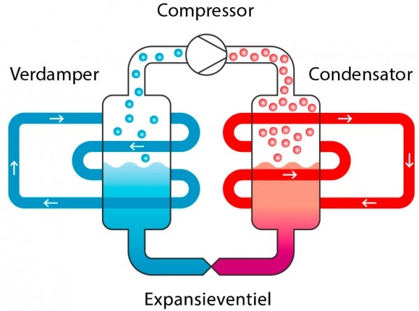 In de praktijk zet een warmtepomp warmte uit een bron om in warmte voor in huis. Deze bron kan warmte zijn uit de buitenlucht, uit de bodem (een gesloten bron) of uit oppervlakte water. In de warmtepomp zit een vloeistof die al bij zeer lage temperatuur (tot -20 graden) verdampt. De warmte uit de bron zet deze vloeistof in de verdamper om in gas. Een compressor perst deze damp samen waardoor de temperatuur van de damp stijgt. Deze hete damp gaat door een warmtewisselaar en geeft daar zijn warmte af aan het koude water uit de cv-installatie. Door het afgeven van warmte en het verlagen van de druk wordt de damp weer vloeistof en kan het hele proces weer opnieuw beginnen. De energie nodig voor het proces is elektriciteit. Zie deze video op YouTube voor een heldere uitleg van het systeem.