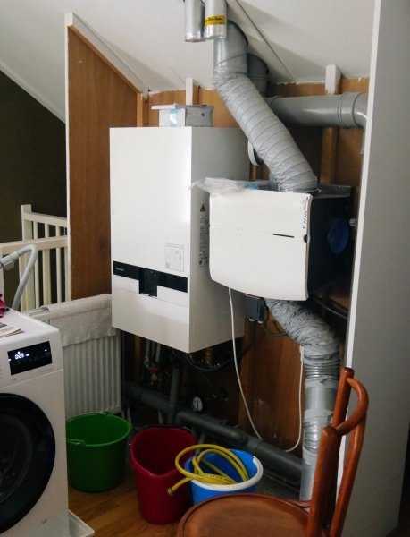 De Aurora II maakt warm water tot maximaal 55 graden celcius voor de verwarming van de woning. Voor warm tapwater gebruikt Adlar een separate warmtepompboiler van Atlantic met een capaciteit van 150, 200 of 300 liter. Als de boiler bij de ventilatiebox wordt geplaatst kan de luchttoevoer-en afvoer worden aangesloten op de warmtepompboiler. Aandachtspunt daarbij is het voorkomen van condens en de aansluiting op het bestaande ventilatiesysteem. Dit moet of achter de bestaande ventilatiebox of met terugslagkleppen om te voorkomen dat de boiler de lucht terugblaast in de woning. De boiler kan worden gecombineerd met zonnecollectoren en samenwerken met zonnepanelen voor warmteopslag bij veel productie van zonne-energie. Zie voor meer informatie het kennisplein en Atlanticclimate.nl Adlar kan de warmtepomp d.m.v. een module op afstand controleren, monitoren en bepaalde problemen verhelpen. Installeren: Het installeren en inregelen van het complete systeem duurt, afhankelijk van de situatie en de voorbereiding door Adlar 1 of 2 dagen en wordt door Adlar zelf uitgevoerd. Bij de dijkwoningen is de buitenunit op het dak geplaatst en lopen de warmwaterleidingen via het rookgasafvoer- en luchttoevoerkanaal van de CV ketel naar binnen tot bij de aansluitpunten van de centrale verwarming in de woning. Zowel buiten als in de woning is het leidingverloop "onzichtbaar". Via een expansievat en een voorraadvat (respectievelijk rood en grijs op de foto) wordt het systeem direct aangesloten op de CV van de woning. De warmtepompboiler wordt bij voorkeur geplaatst op de plek van de CV ketel zodat de boiler direct kan worden aangesloten op het warmtapwatersysteem van de woning. Om de boiler te kunnen aansluiten op het ventilatiesysteem van de woning moet de ventilatiebox in de buurt van de boiler hangen. Bij de meeste woningen in Stadseiland is dat het geval. Voor de twee-onder-een-kap en hoekwoningen (zoals op de Max Euwestraat en Willy den Oudenstraat) is de buitenunit het beste te plaatsen aan de muur boven de garage. Foto rechts muurmontage aan de Max Euwestraat. Je kunt de buitenunit het beste met beugels aan de muur, een stukje boven het platte dak van de garage, laten ophangen, en niet laten afsteunen op het dak. Op deze manier is de unit onafhankelijk van het platte dak, en kun je (mocht dat nodig zijn) reparaties aan het dak doen, zonder de buitenunit te verwijderen. Het leiding- en kabelwerk loopt vanaf de warmtepomp door een verticale koof tegen de gevel recht omhoog en via gaten in de gevel komen de leidingen op zolder waar ze over de vloer langs de muur naar de positie van de huidige cv installatie lopen (waar ook de warmtepompboiler komt). Esthetisch is één rechte koof tegen de gevel beter dan zowel horizontaal als vertikaal verslepen. De nieuwe kabels van de meterkast naar de huidige cv-locatie op de zolder kunnen binnendoor getrokken worden door de gesloten ruimte naast de meterkast, maar dit is wel een lastige klus, aangezien deze ruimte op de eerste etage niet toegankelijk is. Het kostte de monteurs veel moeite om dit voor elkaar te krijgen, maar het is gelukt. Buiten langs de muur is vanuit esthetisch oogpunt geen goede oplossing. Let er bij het plaatsen van de warmtepomp op dat de warmtepomp condenswater genereert en dat dit afgevoerd moet worden. Standaard druppelt het op het dak en komt dan via de regenpijp in het gootje dat tussen de 2 parkeerplaatsen loopt. Dit betekent dat dit gootje vaak nat is, en in de winter wellicht een ijsbaan wordt. Je kunt ook een afvoer (laten) maken naar de achtertuin (als je daar bijvoorbeeld grond hebt wat het water kan opnemen), maar let er dan wel op bij het plaatsen van de warmtepomp, dat er genoeg hoogte is om de afvoer met voldoende afschot over de dakrand te krijgen. |
